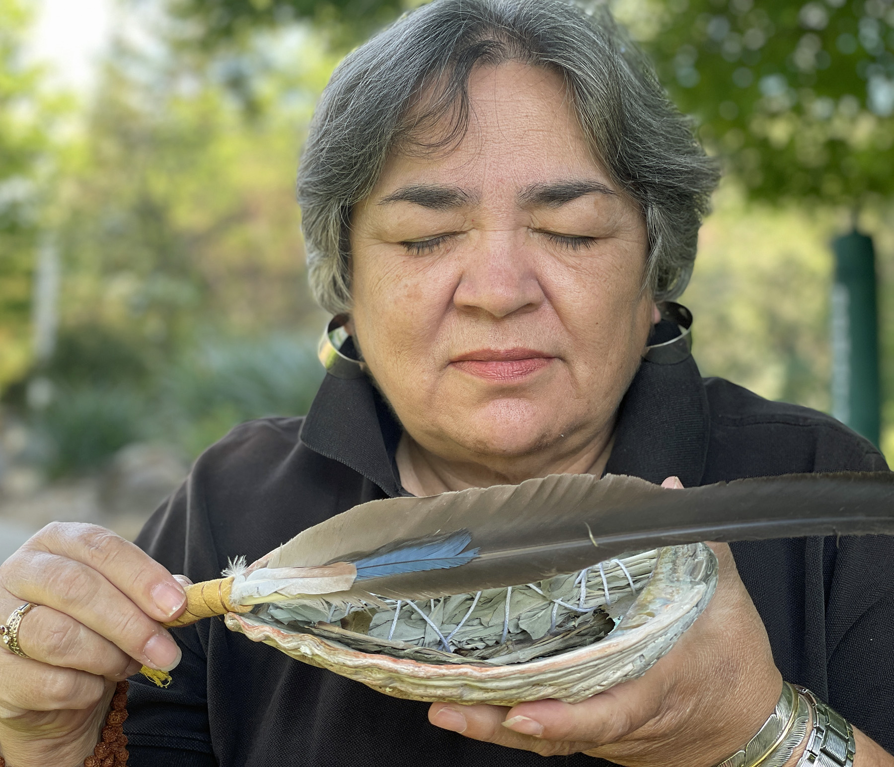Lynn E. Fritz, MA, Karuk Tribal Descendant, offering smudge blessing.